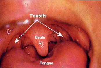 Sakit tekak, susah menelan, demam, kelenjar di leher mungkin membengkak dan sakit, letih/lesu, dan simptom halangan pernafasan (eg; berdengkur, atau tiba tiba tersedar tak boleh bernafas masa tidur, sleep apnoea).